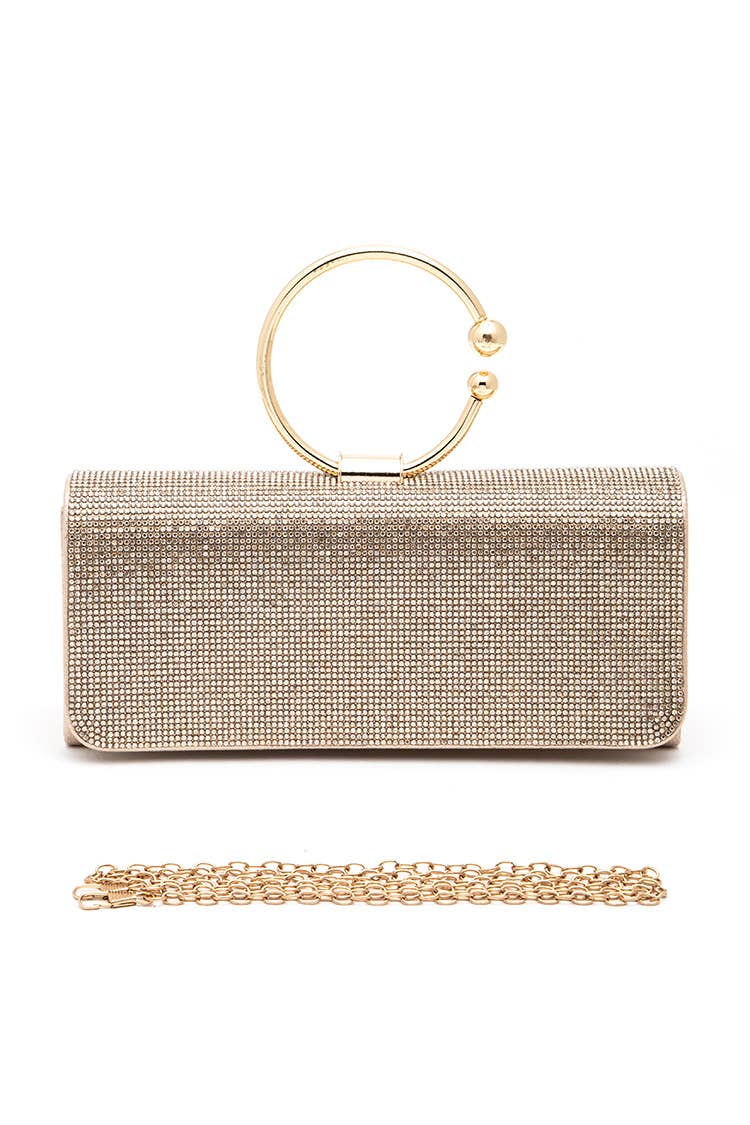 Make an elegant entrance with this Circle Handle Rhinestone Evening Clutch - a sleek, modern take on classic glamour. Covered in shimmering rhinestones, this structured clutch catches the light beautifully from every angle. The standout circular metal handle adds a chic, sculptural touch, while the detachable chain strap offers versatile wear. Perfect for weddings, galas, and nights out.