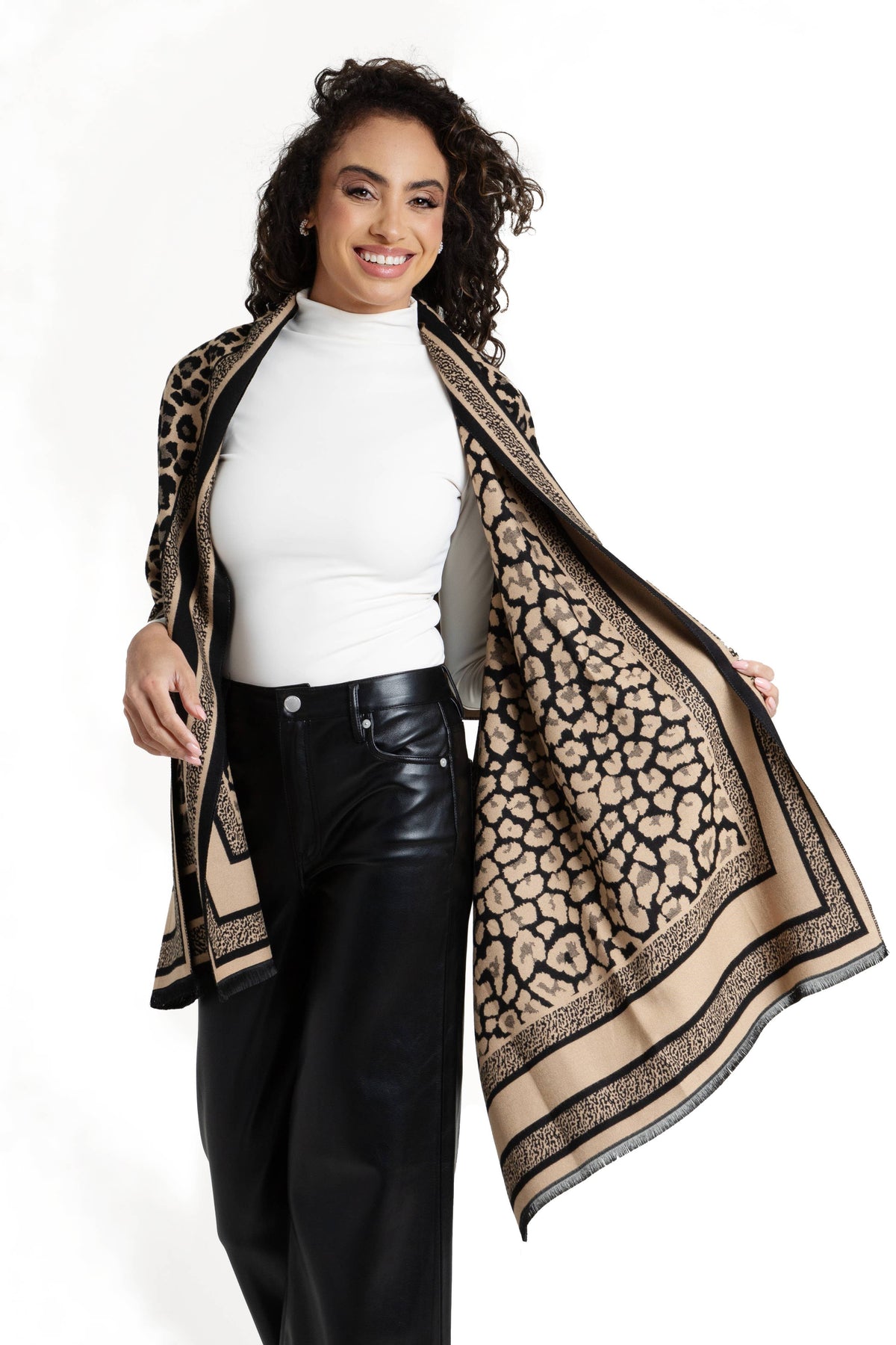 Discover our Reversible Leopard Pattern Scarf! It features a striking leopard pattern on both sides in different colors, adding a touch of wild elegance to your outfit, while delicate fringe detailing adorns the edges. Whether you're aiming for a sophisticated, urban vibe or a bohemian, free-spirited look, this reversible scarf is the perfect choice.
