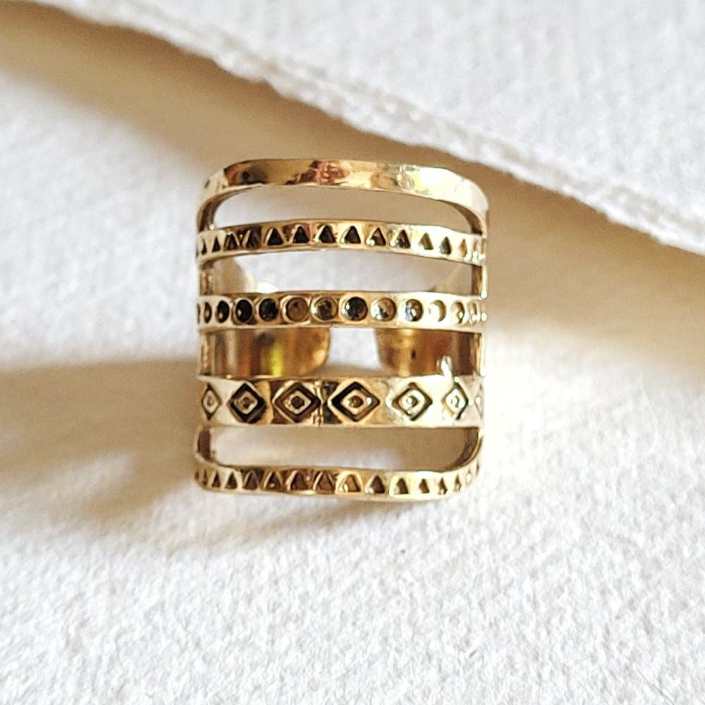 Brass ring handmade multiple banded-adjustable. It stands all on its own.