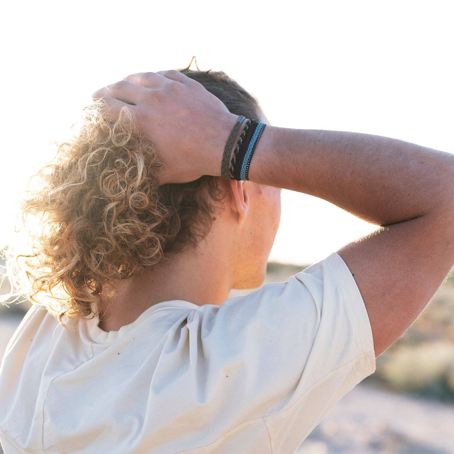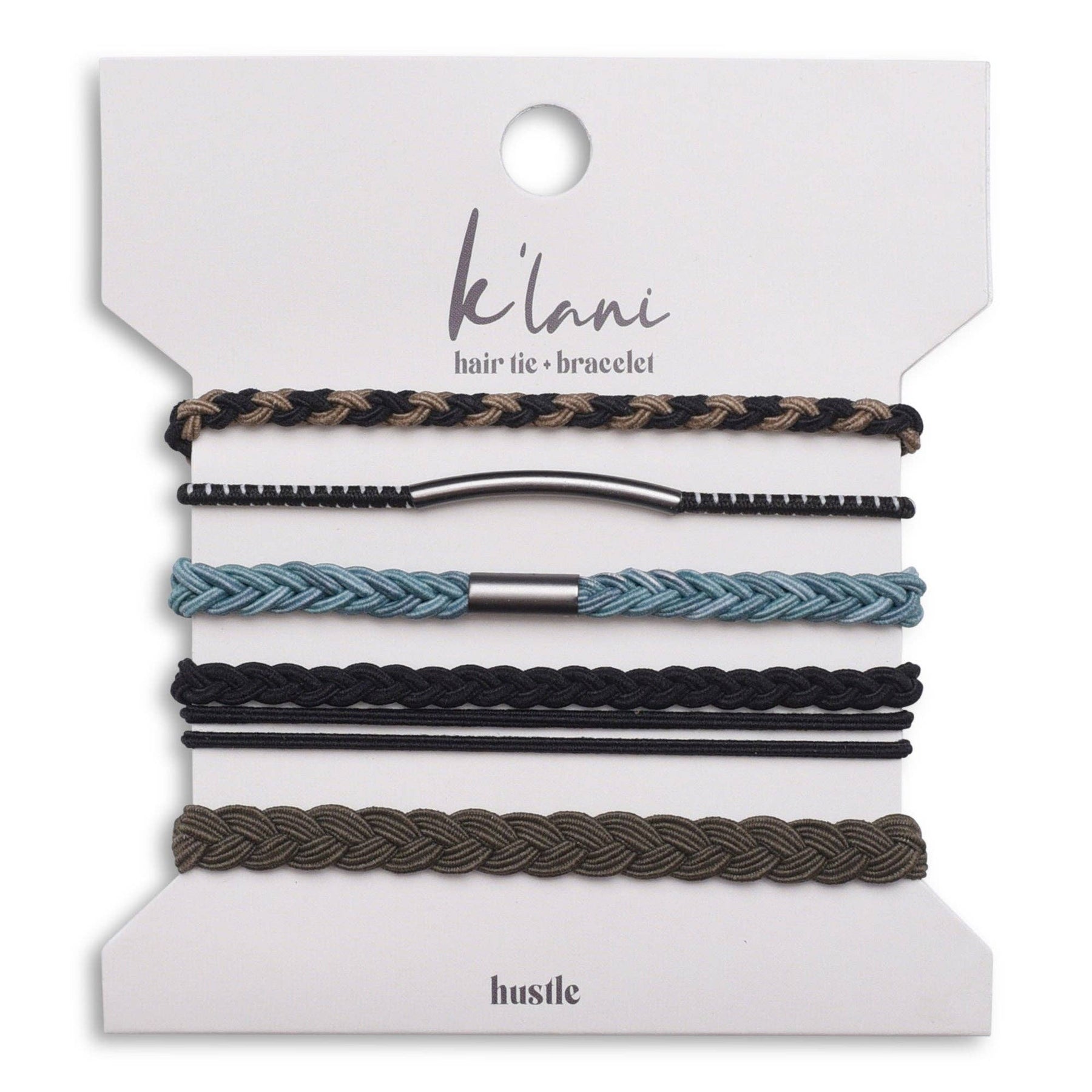 This "Hustle" Hair Tie Bracelet Set includes five hair tie bracelets in strong colors of black, brown, and blue with matte black details. This set is perfect for guys and girls and will make all who wear it bring a little more hustle to their game. This set is a favorite for guys as well. Medium is the size of a normal hair tie band. It will fit wrists between 5-6.5" around. Large is sized for wrists over 6.5 "