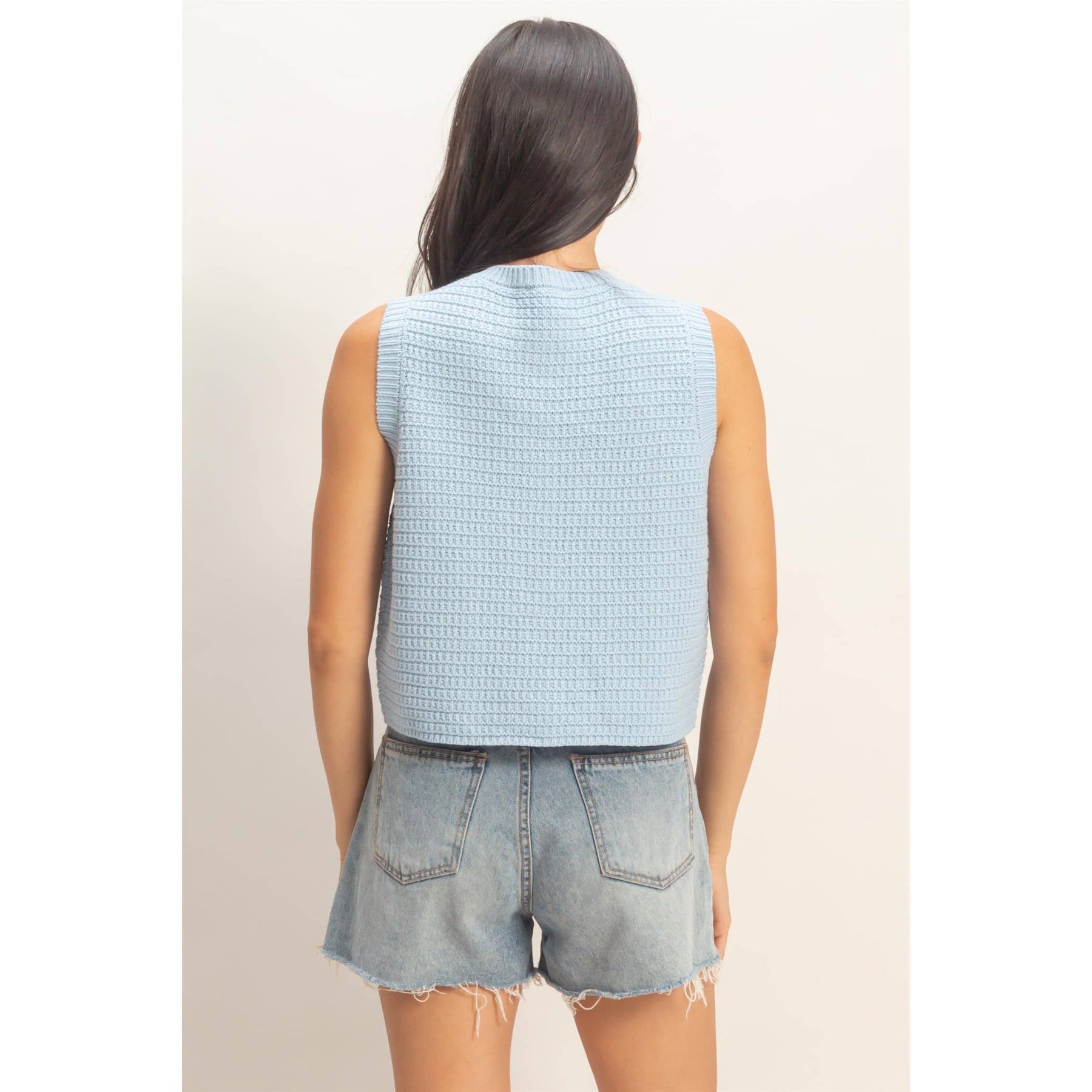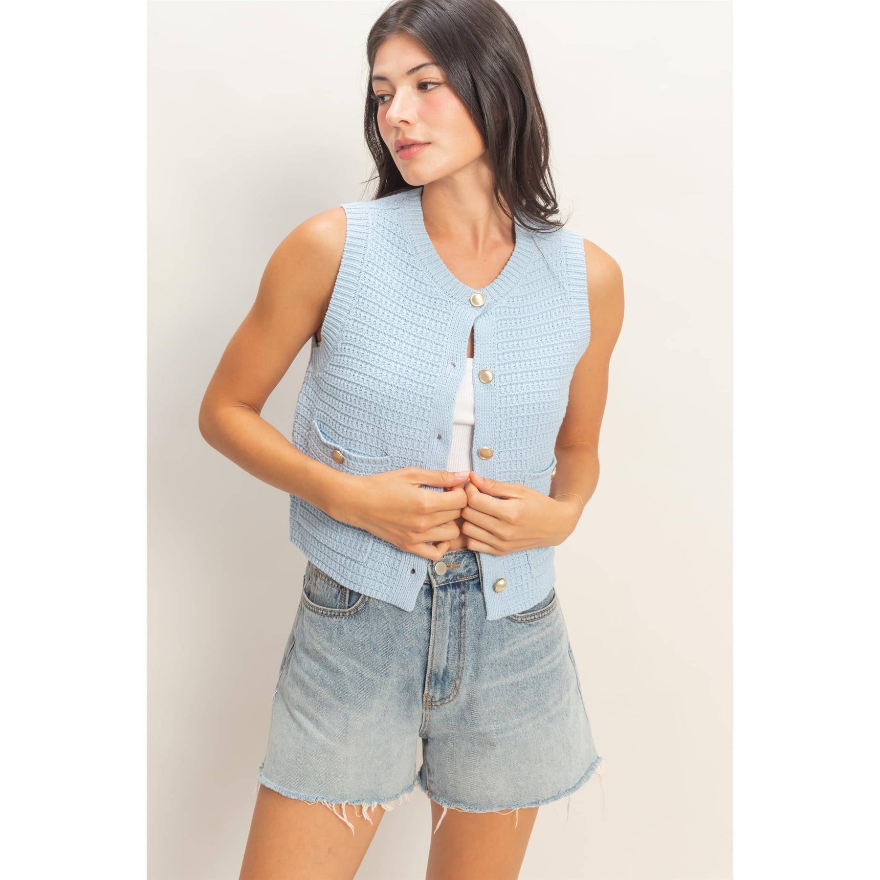 This textured sleeveless knit vest features a ribbed crew neckline and a polished button-up front adorned with gold buttons. The fitted silhouette is accentuated by two front patch pockets. Cut to a waist-level cropped length, this piece can be worn open or closed over a slim-fitting turtleneck or long-sleeve tee for a sophisticated weekend look. Model Is 5' 8" Tall, 32" Chest, 25" Waist, 35" Hips And Wearing Small